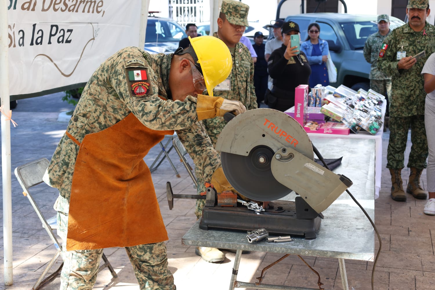 Soldier destroying a firearm at a “Sí al Desarme, Sí a la Paz” disarmament module. Source: Progreso Hoy.